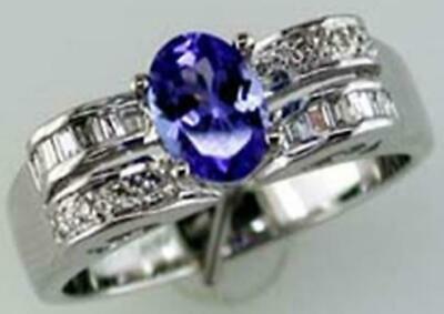 14KT WHITE GOLD FRIENDHSIP LOVE RING. 3D CLASSIC DESIGN. ROUND AND BAGUETTE DIAMONDS ARE F/G COLOR, VSSI CLARITY .30 CARATS. AAA OVAL TANZANITE IS .75 CARATS. RING SIZE 7. CAN BE SIZED BY OUR MASTER JEWELER UPON REQUEST. WRITTEN APPRAISAL AVAILABLE. COMES IN A PRESENTABLE GIFT BOX.
