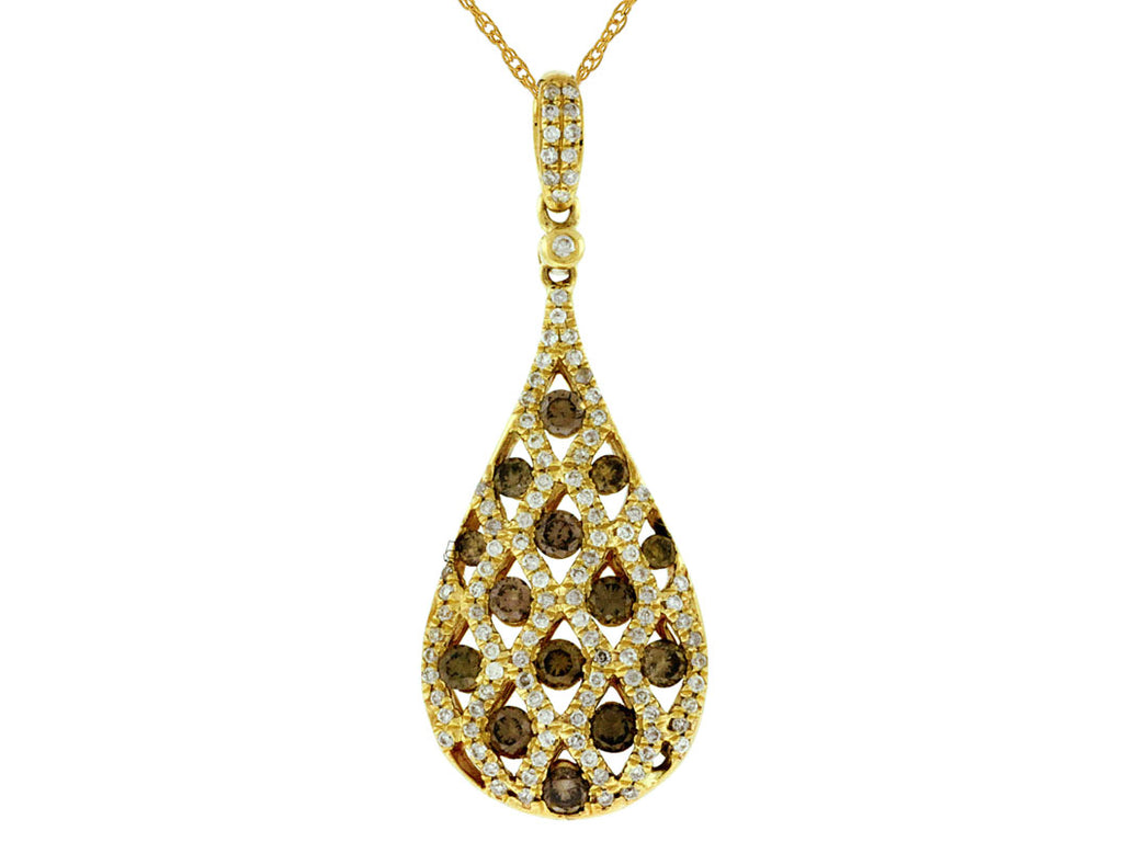 1.05CT WHITE & MOCHA DIAMOND 14KT YELLOW GOLD 3D OPEN FILIGREE TEAR DROP PENDANT
