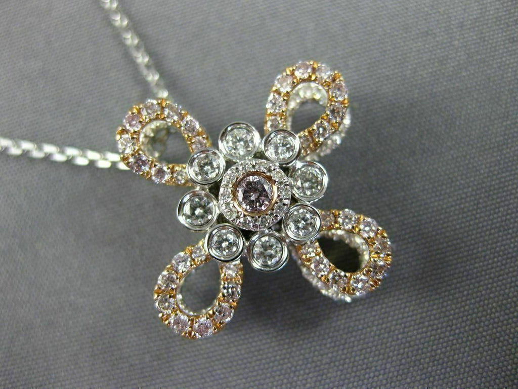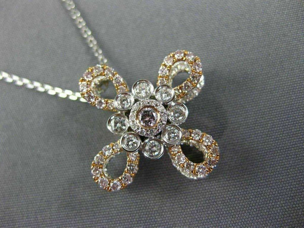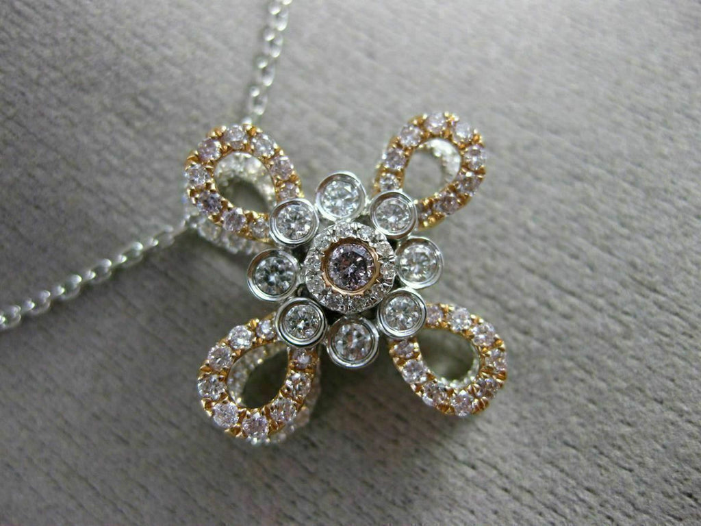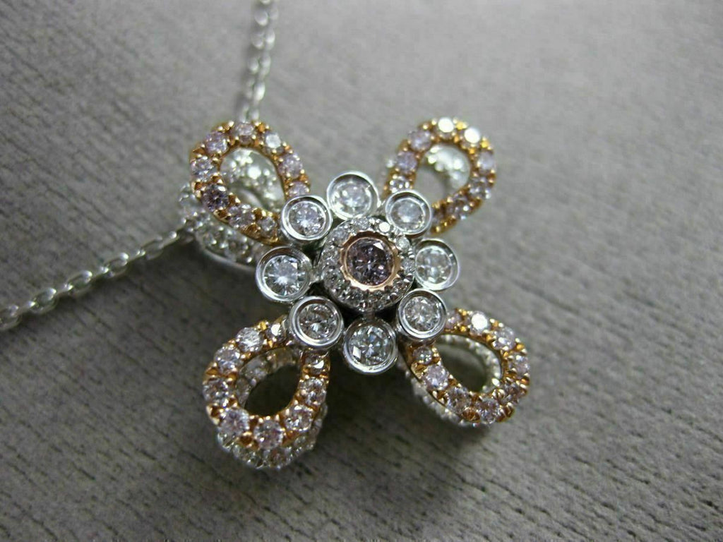 14KT WHITE & ROSE GOLD PENDANT. 3D FLOWER DESIGN. WHITE DIAMONDS ARE F/G COLOR, VSSI CLARITY .65 CARATS. PINK DIAMONDS ARE .40 CARATS. MEASURES 21mm WIDE. COMES ON A 14KT GOLD DIAMOND CUT 16"-18" INCH CHAIN. WRITTEN APPRAISAL AVAILABLE. COMES IN A PRESENTABLE GIFT BOX