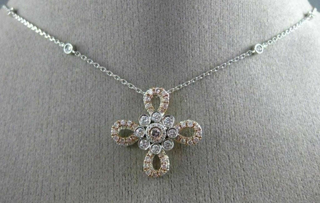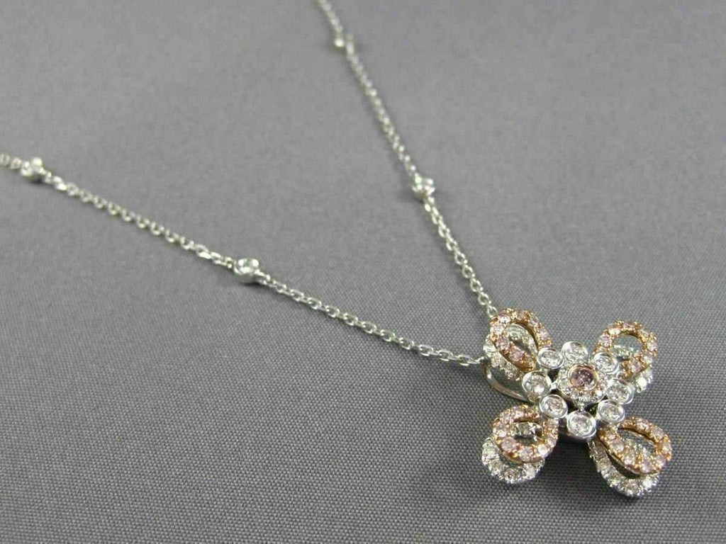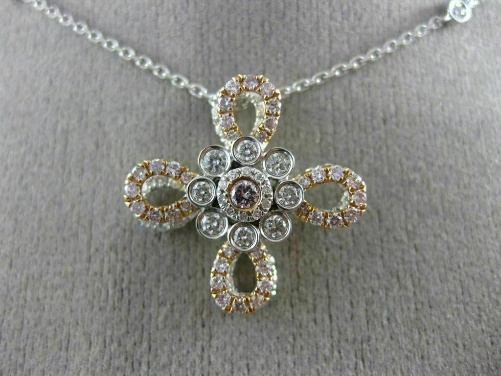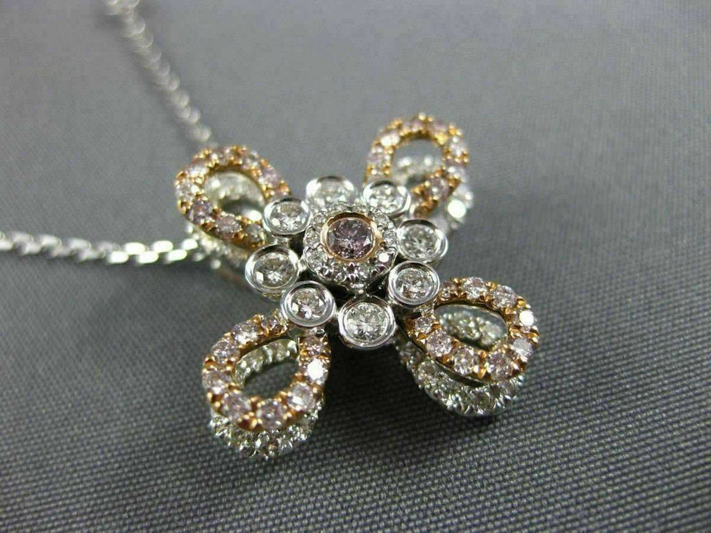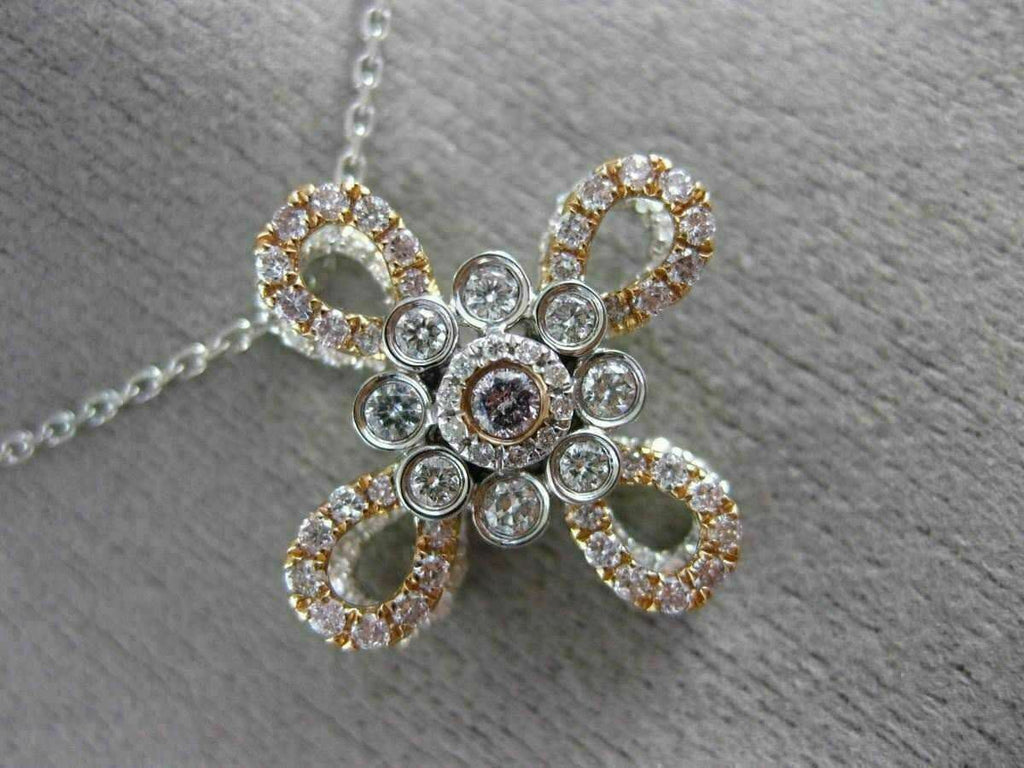 14KT WHITE & ROSE GOLD PENDANT. 3D FLOWER DESIGN. WHITE DIAMONDS ARE F/G COLOR, VSSI CLARITY .65 CARATS. PINK DIAMONDS ARE .40 CARATS. MEASURES 21mm WIDE. COMES ON A 14KT GOLD DIAMOND CUT 16"-18" INCH CHAIN. WRITTEN APPRAISAL AVAILABLE. COMES IN A PRESENTABLE GIFT BOX
