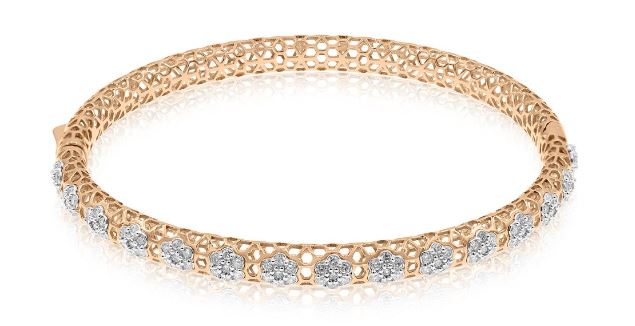 1.06CT DIAMOND 18KT 2 TONE GOLD MULTI FLOWER FILIGREE CUFF FUN BANGLE BRACELET