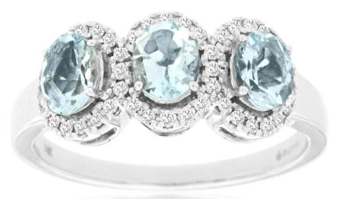 14KT WHITE GOLD LOVE RING. 3D THREE STONE HALO DESIGN. ROUND DIAMONDS ARE F/G COLOR, VSSI CLARITY .16 CARATS. AAA OVAL AQUAMARINES ARE .90 CARATS. RING SIZE 7. CAN BE SIZED BY OUR MASTER JEWELER UPON REQUEST. WRITTEN APPRAISAL AVAILABLE. COMES IN A PRESENTABLE GIFT BOX.