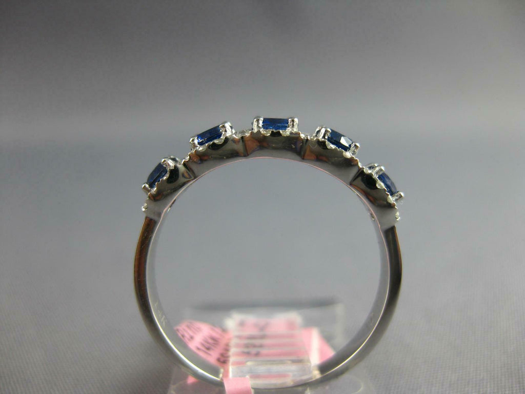 14KT WHITE GOLD ANNIVERSARY RING. 3D FIVE STONE HALO DESIGN. DIAMONDS ARE F/G COLOR, VVS-VS CLARITY .24 CARATS. AAA SAPPHIRES ARE .82 CARATS. MEASURES 5MM WIDE. RING SIZE 6.75. CAN BE SIZED BY OUR MASTER JEWELER UPON REQUEST. WRITTEN APPRAISAL AVAILABLE. COMES IN A PRESENTABLE GIFT BOX.
