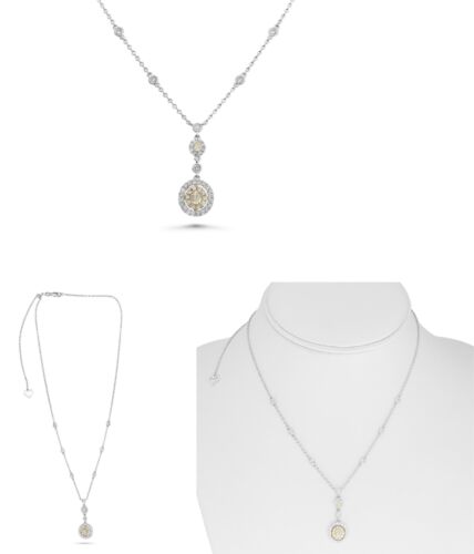 18KT WHITE AND YELLOW GOLD LOVE NECKLACE. 3D DOUBLE HALO FLORAL BY THE YARD DESIGN. ROUND WHITE DIAMONDS ARE F/G COLOR, VS CLARITY .48 CARATS. OVAL FANCY YELLOW DIAMONDS ARE .42 CARATS. ROUND FANCY YELLOW DIAMONDS ARE .16 CARATS. 18" INCHES LONG. WRITTEN APPRAISAL AVAILABLE. COMES IN A PRESENTABLE GIFT BOX.