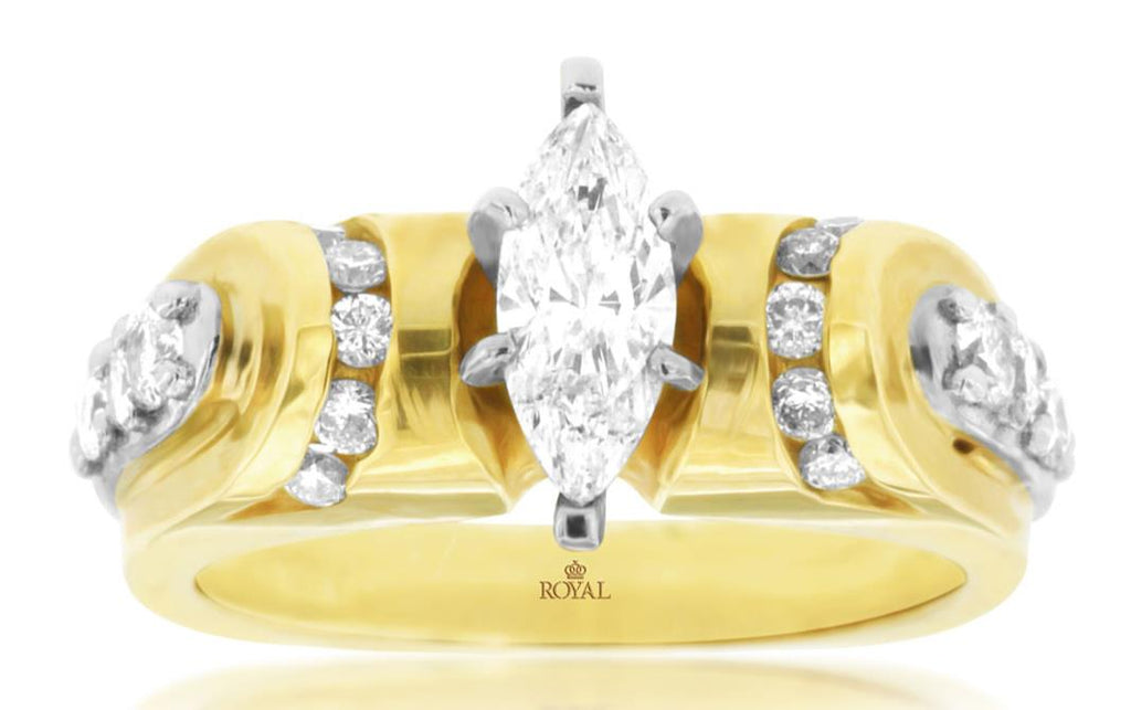 14KT YELLOW GOLD ENGAGEMENT RING. 3D CLASSIC DESIGN. DIAMONDS ARE F/G COLOR, VSSI CLARITY. CENTER MARQUISE DIAMOND IS .54 CARATS. SIDE ROUND DIAMONDS ARE .55 CARATS. RING SIZE 7. CAN BE SIZED BY OUR MASTER JEWELER UPON REQUEST. WRITTEN APPRAISAL AVAILABLE. COMES IN A PRESENTABLE GIFT BOX.