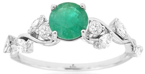 14KT WHITE GOLD ENGAGEMENT RING. 3D FLORAL DESIGN. MARQUISE SHAPE AND ROUND DIAMONDS ARE F/G COLOR, VSSI CLARITY .33 CARATS. AAA ROUND EMERALD IS .76 CARATS. RING SIZE 7. CAN BE SIZED BY OUR MASTER JEWELER UPON REQUEST. WRITTEN APPRAISAL AVAILABLE. COMES IN A PRESENTABLE GIFT BOX.