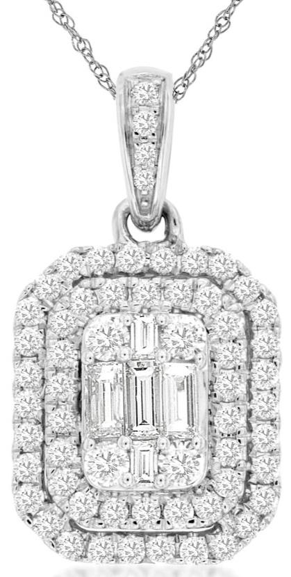 1.0CT DIAMOND 14K WHITE GOLD ROUND & BAGUETTE DOUBLE HALO SQUARE OCTAGON PENDANT