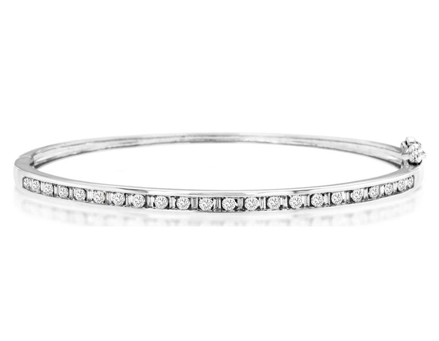 14KT WHITE GOLD BANGLE BRACELET. 3D CLASSIC CHANNEL SEMI ETERNITY DESIGN. ROUND AND BAGUETTE DIAMONDS ARE F/G COLOR, VSSI CLARITY 1.0 CARAT. FITS UP TO 7" INCH WRIST. WRITTEN APPRAISAL AVAILABLE. COMES IN A PRESENTABLE GIFT BOX.
