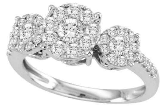 14KT WHITE GOLD PROMISE RING . 3D CLUSTER FLOWER SEMI ETERNITY DESIGN. ROUND DIAMONDS ARE 1.0 CARATS F/G COLOR, VSSI CLARITY. RING SIZE. IS 6.75. CAN BE SIZED BY OUR MASTER JEWELER UPON REQUEST. WRITTEN APPRAISAL AVAILABLE. COMES IN A PRESENTABLE GIFT BOX.