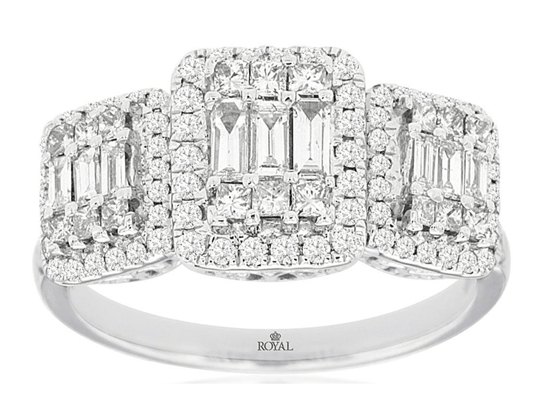 14KT WHITE GOLD ANNIVERSARY RING. 3D CLUSTER PAST PRESENT FUTURE SQUARE HALO DESIGN. ROUND AND BAGUETTE DIAMONDS ARE F/G COLOR, VSSI CLARITY 1.0 CARAT. RING SIZE 7. CAN BE SIZED BY OUR MASTER JEWELER UPON REQUEST. WRITTEN APPRAISAL AVAILABLE. COMES IN A PRESENTABLE GIFT BOX.