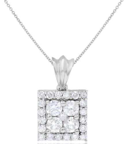 14KT WHITE GOLD FUN FLOATING PENDANT. 3D CLASSIC SQUARE FOUR STONE HALO DESIGN. ROUND DIAMONDS ARE F/G COLOR, VSSI CLARITY 1.0 CARAT. COMES ON A 14KT GOLD DIAMOND CUT 16" INCH CHAIN. WRITTEN APPRAISAL AVAILABLE. COMES IN A PRESENTABLE GIFT BOX.