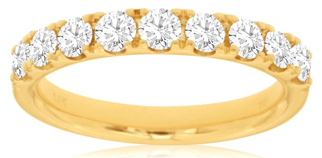 14KT YELLOW GOLD ANNIVERSARY RING. 3D CLASSIC NINE STONE SEMI ETERNITY DESIGN. ROUND DIAMONDS ARE F/G COLOR, VSSI CLARITY 1.0 CARAT. RING SIZE 7. CAN BE SIZED BY OUR MASTER JEWELER UPON REQUEST. WRITTEN APPRAISAL AVAILABLE. COMES IN A PRESENTABLE GIFT BOX.