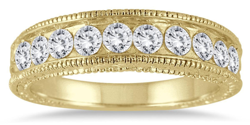 14KT YELLOW GOLD WEDDING ANNIVERSARY RING. 3D CLASSIC SEMI ETERNITY FILIGREE CHANNEL DESIGN. ROUND DIAMONDS ARE G/H COLOR, SI CLARITY 1.0 CARAT. RING SIZE 6.5. CAN BE SIZED BY OUR MASTER JEWELER UPON REQUEST. WRITTEN APPRAISAL AVAILABLE. COMES IN A PRESENTABLE GIFT BOX.