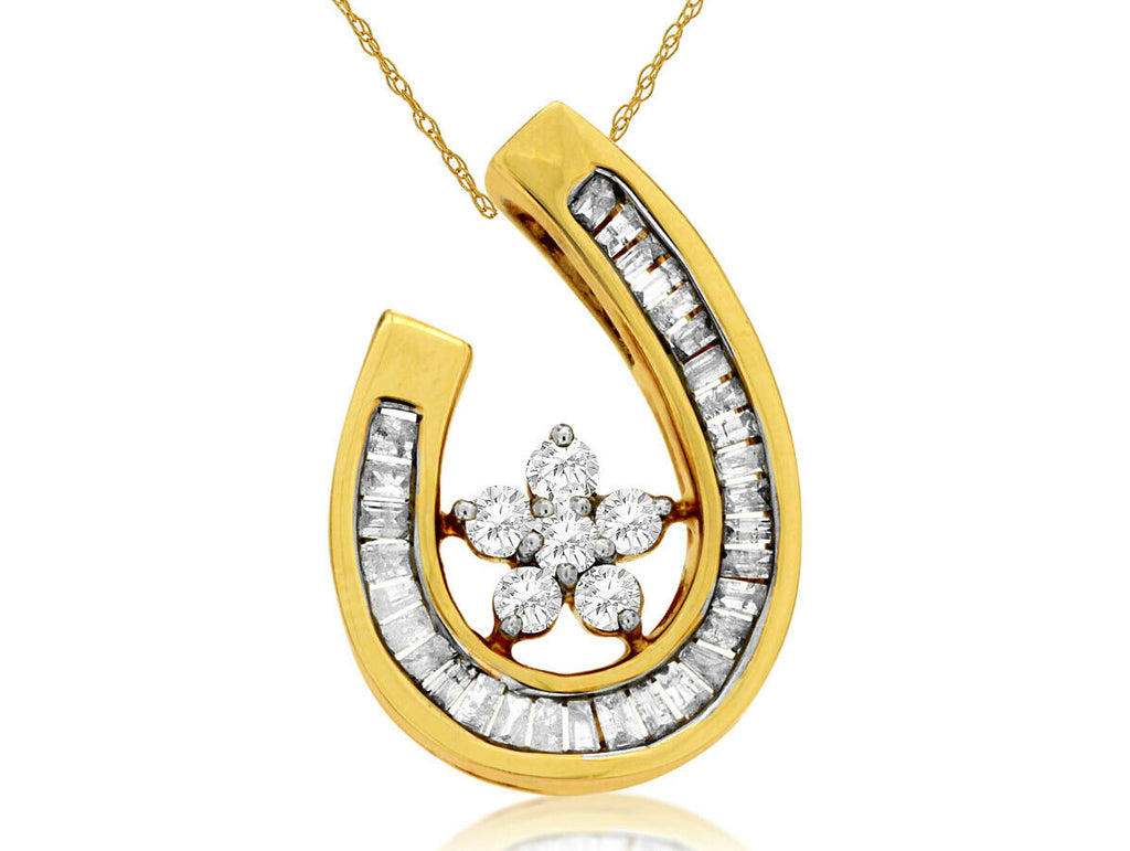 1.0CT DIAMOND 14KT YELLOW GOLD ROUND AND BAGUETTE FLOWER HORSESHOE LOVE PENDANT