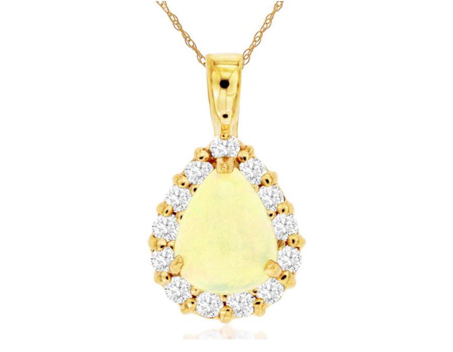14KT YELLOW GOLD FLOATING PENDANT. 3D CLASSIC HALO DESIGN. ROUND DIAMONDS ARE F/G COLOR, VSSI CLARITY .30 CARATS. AAA PEAR SHAPE OPAL IS .70 CARATS. COMES ON A 14KT GOLD DIAMOND CUT 18" INCH CHAIN. WRITTEN APPRAISAL AVAILABLE. COMES IN A PRESENTABLE GIFT BOX.