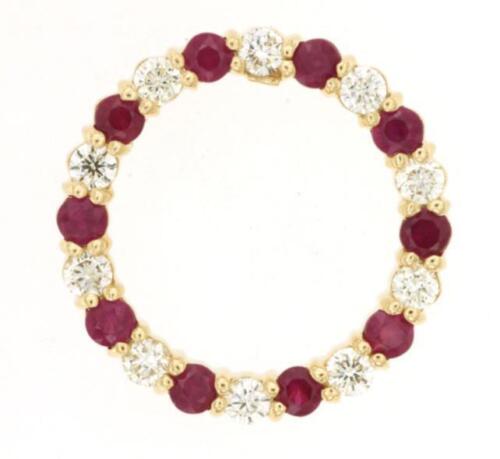 14KT YELLOW GOLD FLOATING PENDANT. 3D SHARED PRONG CIRCLE OF LIFE DESIGN. DIAMONDS ARE F/G COLOR, VSSI CLARITY .50 CARATS. AAA ROUND RUBIES ARE .50 CARATS. COMES ON A 14KT GOLD DIAMOND CUT 16" INCH CHAIN. WRITTEN APPRAISAL AVAILABLE. COMES IN A PRESENTABLE GIFT BOX.