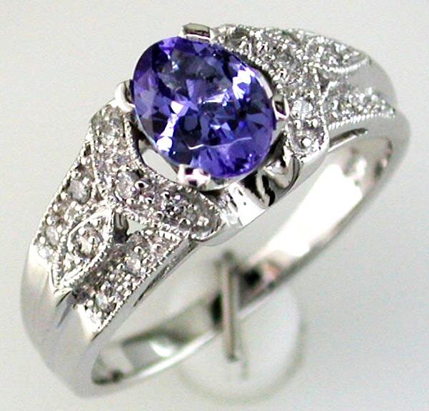 14KT WHITE GOLD FUN RING. 3D MILGRAIN DESIGN. ROUND DIAMONDS ARE F/G COLOR, VSSI CLARITY .15 CARATS. AAA OVAL TANZANITE IS .85 CARATS. RING SIZE 7. CAN BE SIZED BY OUR MASTER JEWELER UPON REQUEST. WRITTEN APPRAISAL AVAILABLE. COMES IN A PRESENTABLE GIFT BOX.