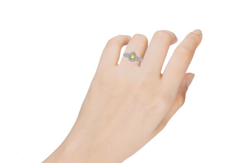 18KT WHITE AND YELLOW GOLD ENGAGEMENT RING. 3D HALO DESIGN. ROUND WHITE DIAMONDS ARE F/G COLOR, VSSI CLARITY .56 CARATS. PEAR SHAPE FANCY YELLOW DIAMOND IS .44 CARATS. RING SIZE 7. CAN BE SIZED BY OUR MASTER JEWELER UPON REQUEST. WRITTEN APPRAISAL AVAILABLE. COMES IN A PRESENTABLE GIFT BOX.