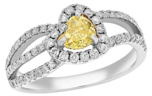 18KT WHITE GOLD ENGAGEMENT RING. 3D DOUBLE HEART HALO DESIGN. WHITE DIAMONDS ARE F/G COLOR, VSSI CLARITY .52 CARATS. FANCY YELLOW DIAMOND IS .48 CARATS. RING SIZE 7. CAN BE SIZED BY OUR MASTER JEWELER UPON REQUEST. WRITTEN APPRAISAL AVAILABLE. COMES IN A PRESENTABLE GIFT BOX.
