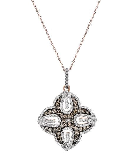 1.0CT WHITE & MOCHA DIAMOND 14KT WHITE & ROSE GOLD 4 LEAF CLOVER FLOWER PENDANT