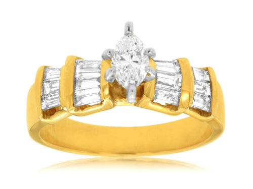 14KT YELLOW GOLD ENGAGEMENT RING. 3D CLASSIC DESIGN. DIAMONDS ARE F/G COLOR, VSSI CLARITY. MARQUISE SHAPE DIAMONDS ARE .42 CARATS. BAGUETTE DIAMONDS ARE .68 CARATS. CAN BE SIZED BY OUR MASTER JEWELER UPON REQUEST. WRITTEN APPRAISAL AVAILABLE. COMES IN A PRESENTABLE GIFT BOX.