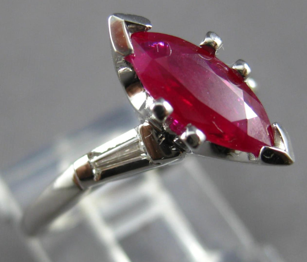 14KT WHITE GOLD ENGAGEMENT RING. 3D CLASSIC THREE STONE DESIGN. BAGUETTE DIAMONDS ARE F/G COLOR, VVS-VS CLARITY .14 CARATS. AAA MARQUISE SHAPE RUBY IS .96 CARATS. MEASURES 12.5mm WIDE. RING SIZE 6. CAN BE SIZED BY OUR MASTER JEWELER UPON REQUEST. WRITTEN APPRAISAL AVAILABLE. COMES IN A PRESENTABLE GIFT BOX.