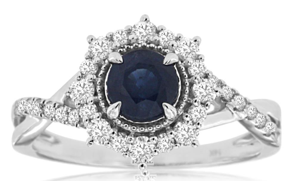 14KT WHITE GOLD LOVE RING. 3D FLOWER INFINITY DESIGN. ROUND DIAMONDS ARE F/G COLOR, VSSI CLARITY .45 CARATS. AAA ROUND SAPPHIRE IS .65 CARATS. RING SIZE 7. CAN BE SIZED BY OUR MASTER JEWELER UPON REQUEST. WRITTEN APPRAISAL AVAILABLE. COMES IN A PRESENTABLE GIFT BOX.