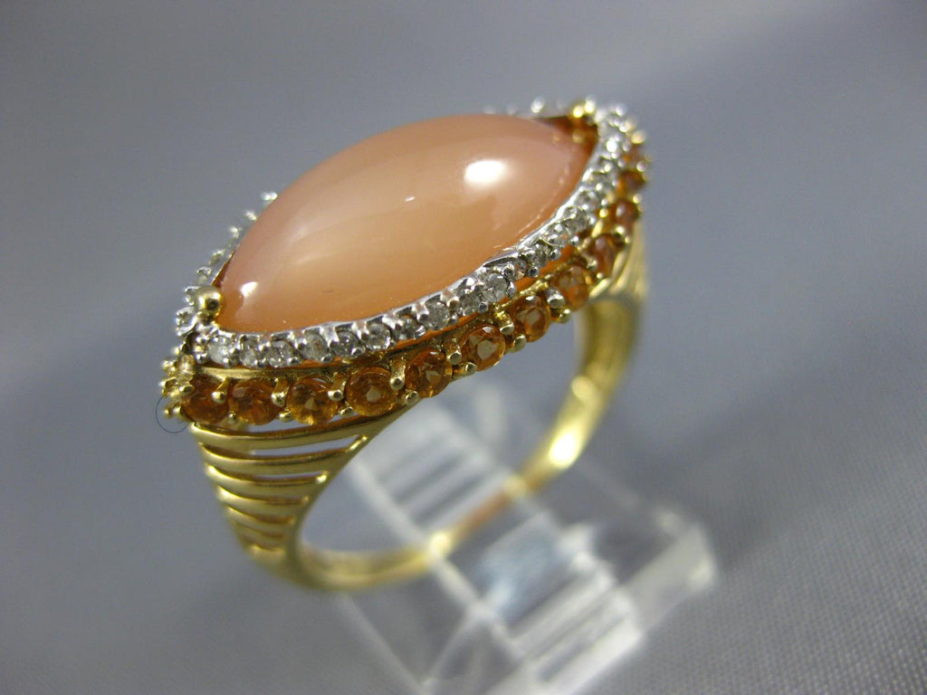 14KT WHITE AND YELLOW GOLD FUN RING. 3D MARQUISE SHAPE DESIGN. DIAMONDS ARE F/G COLOR, VSSI CLARITY .30 CARATS. AAA YELLOW SAPPHIRES ARE .80 CARATS. FEATURES AAA PINKISH ORANGE QUARTZ. MEASURES 12mm X 23mm. RING SIZE 8.25. CAN BE SIZED BY OUR MASTER JEWELER UPON REQUEST. WRITTEN APPRAISAL AVAILABLE. COMES IN A PRESENTABLE GIFT BOX.