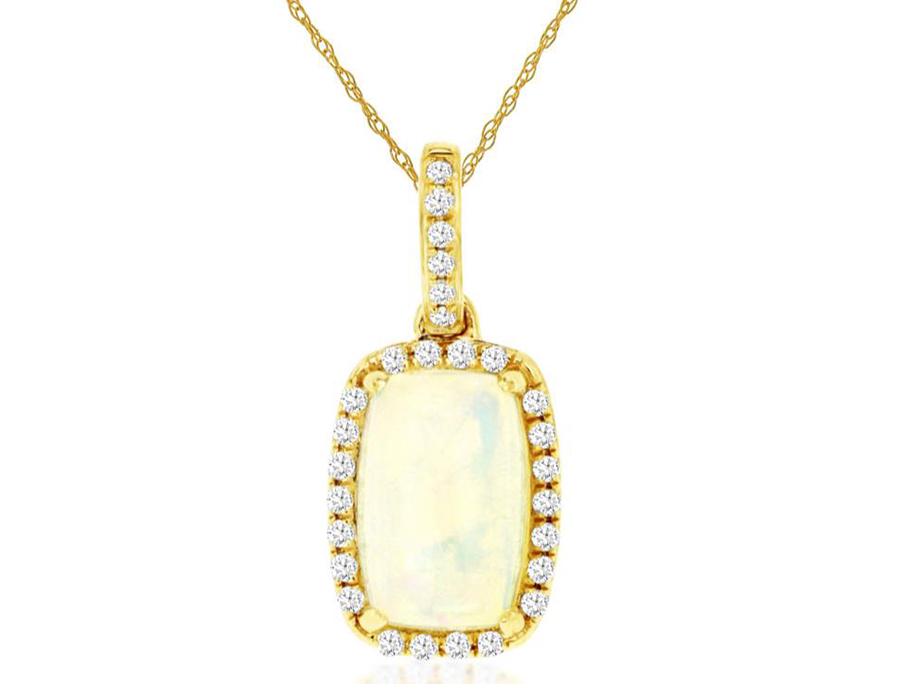 14KT YELLOW GOLD FLOATING PENDANT. 3D CLASSIC HALO RECTANGULAR DESIGN. ROUND DIAMONDS ARE F/G COLOR, VSSI CLARITY .11 CARATS. AAA CUSHION CUT OPAL IS 1.0 CARAT. COMES ON A 14KT GOLD DIAMOND CUT 18" INCH CHAIN. WRITTEN APPRAISAL AVAILABLE. COMES IN A PRESENTABLE GIFT BOX.