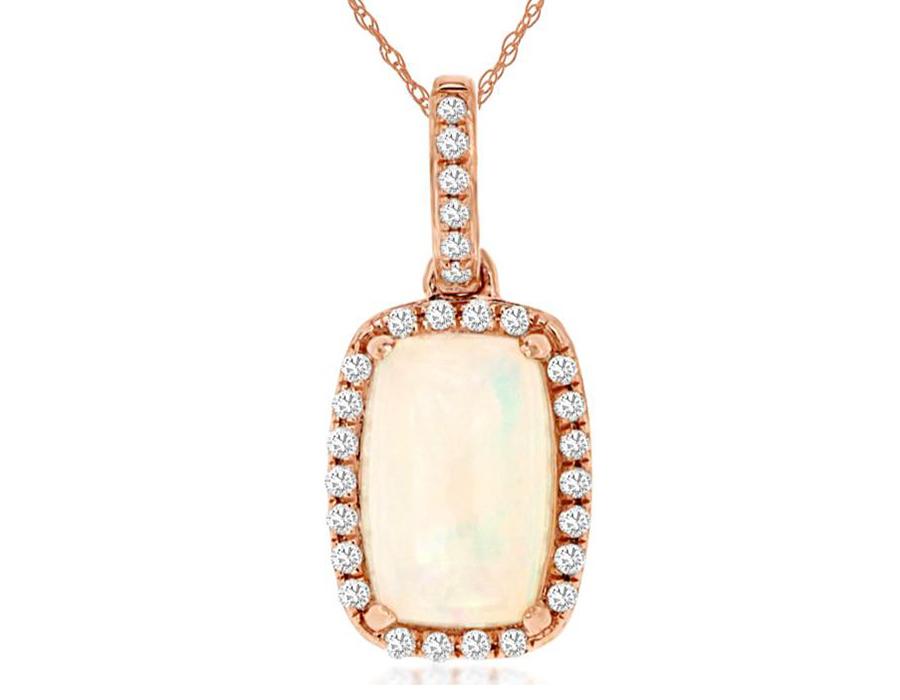 14KT ROSE GOLD FLOATING PENDANT. 3D SQUARE HALO DESIGN. ROUND DIAMONDS ARE F/G COLOR, VSSI CLARITY .11 CARATS. AAA CUSHION CUT OPAL IS 1.0 CARAT. COMES ON A 14KT GOLD DIAMOND CUT 18" INCH CHAIN. WRITTEN APPRAISAL AVAILABLE. COMES IN A PRESENTABLE GIFT BOX.