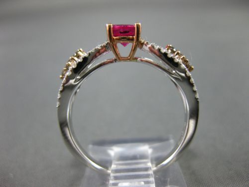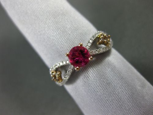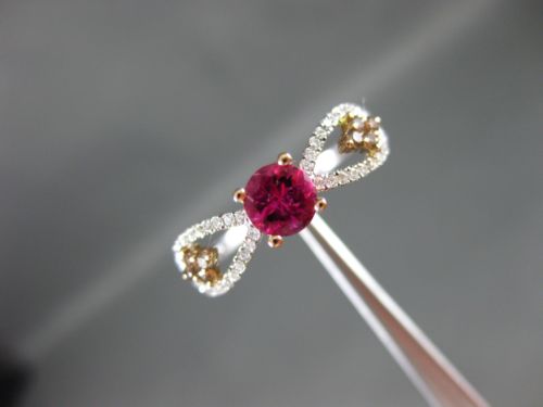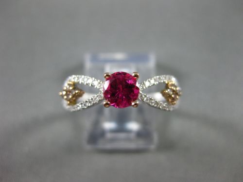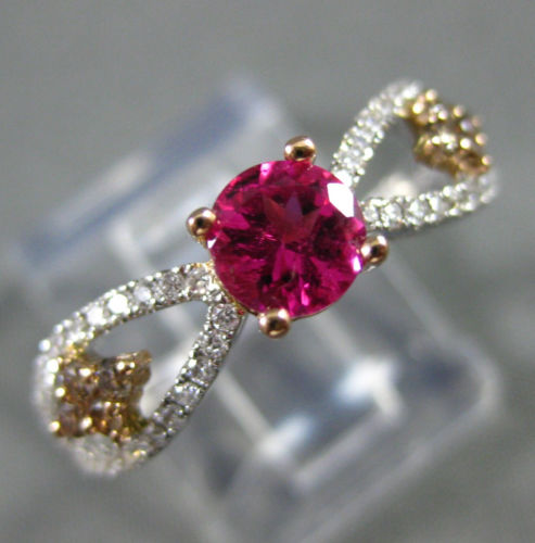 14KT WHITE AND ROSE GOLD ENGAGEMENT RING. 3D CLASSIC INFINITY DESIGN. WHITE AND CHOCOLATE DIAMONDS ARE F/G COLOR, VSSI CLARITY .36 CARATS. AAA PINK TOURMALINE IS .75 CARATS. MEASURES 5mm WIDE. RING SIZE 7.25. CAN BE SIZED BY OUR MASTER JEWELER UPON REQUEST. WRITTEN APPRAISAL AVAILABLE. COMES IN A PRESENTABLE GIFT BOX.