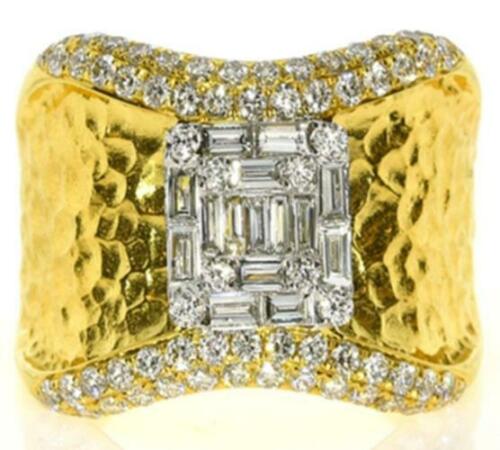 18KT WHITE AND YELLOW GOLD FUN RING. 3D CLUSTER SQUARE HAMMERED DESIGN. DIAMONDS ARE F/G COLOR, VSSI CLARITY. ROUND DIAMONDS ARE .74 CARATS. BAGUETTE DIAMONDS ARE .38 CARATS. RING SIZE 7. CAN BE SIZED BY OUR MASTER JEWELER UPON REQUEST. WRITTEN APPRAISAL AVAILABLE. COMES IN A PRESENTABLE GIFT BOX.