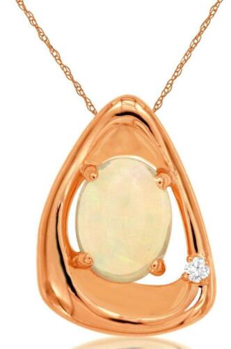 14KT ROSE GOLD FUN FLOATING PENDANT. 3D CLASSIC TRIANGULAR DESIGN. ROUND DIAMONDS ARE F/G COLOR, VSSI CLARITY .02 CARATS. AAA OVAL OPAL IS 1.10 CARATS. COMES ON A 14KT GOLD DIAMOND CUT 16" INCH CHAIN. WRITTEN APPRAISAL AVAILABLE. COMES IN A PRESENTABLE GIFT BOX.