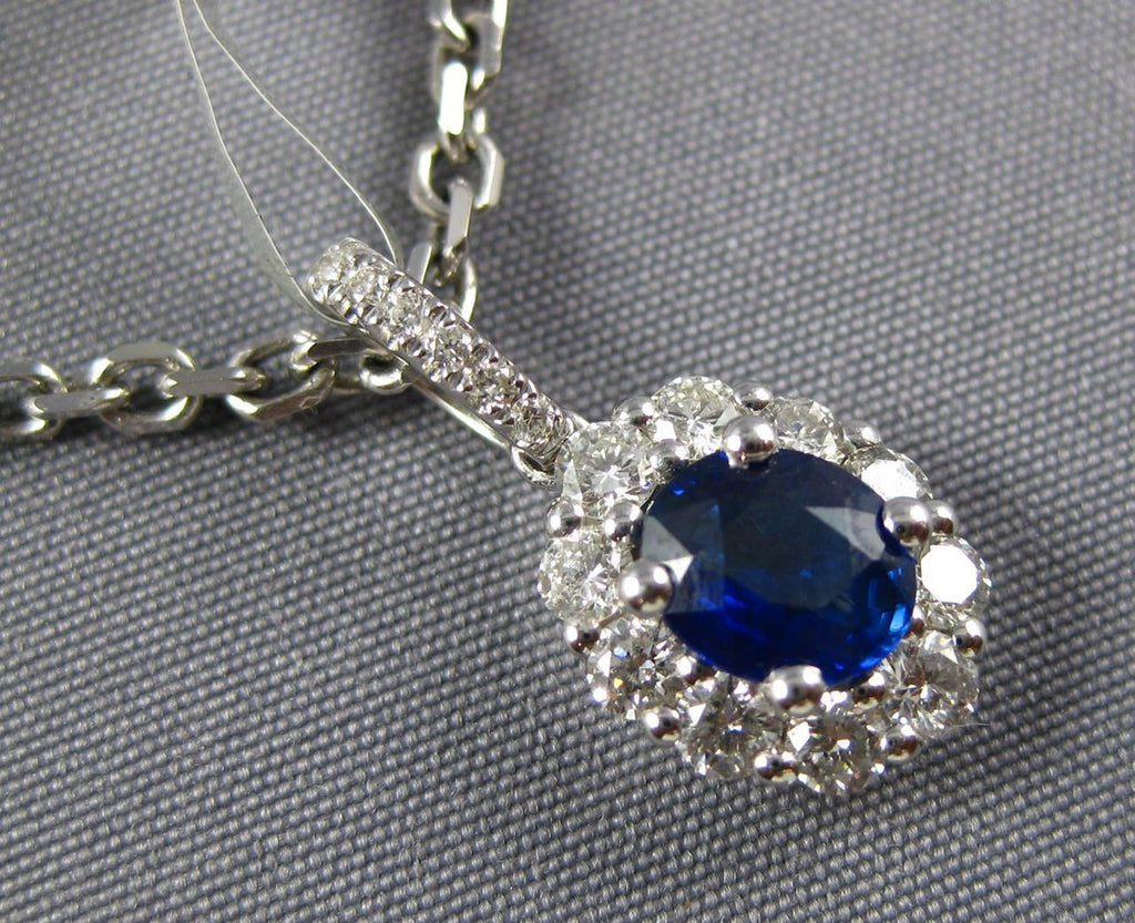 18KT WHITE GOLD FLOATING PENDANT. 3D FLOWER DESIGN. ROUND DIAMONDS ARE F/G COLOR, VS CLARITY .45 CARATS. AAA ROUND SAPPHIRE IS .67 CARATS. MEASURES 17mm X 8mm. COMES ON A 14KT GOLD DIAMOND CUT 16" INCH CHAIN. WRITTEN APPRAISAL AVAILABLE. COMES IN A PRESENTABLE GIFT BOX.