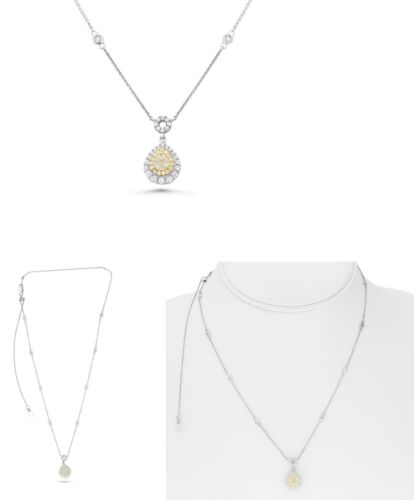18KT WHITE AND YELLOW GOLD LOVE NECKLACE. 3D DOUBLE HALO TEAR DROP BY THE YARD DESIGN. ROUND WHITE DIAMONDS ARE F/G COLOR, VS CLARITY .56 CARATS. ROUND FANCY YELLOW DIAMONDS ARE .10 CARATS. PEAR SHAPE FANCY YELLOW DIAMONDS ARE .47 CARATS. 17" INCHES LONG. WRITTEN APPRAISAL AVAILABLE. COMES IN A PRESENTABLE GIFT BOX.