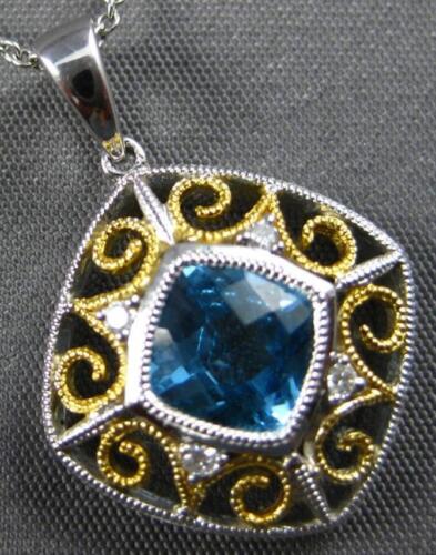 14KT WHITE AND YELLOW GOLD FUN FLOATING PENDANT. 3D FILIGREE SQUARE DESIGN. ROUND DIAMONDS ARE F/G COLOR, VSSI CLARITY .04 CARATS. AAA EXTRA FACETED CUSHION CUT BLUE TOPAZ IS 1.10 CARATS. MEASURES 21.5mm X 15mm. COMES ON A 14KT GOLD DIAMOND CUT 16" INCH CHAIN. WRITTEN APPRAISAL AVAILABLE. COMES IN A PRESENTABLE GIFT BOX.