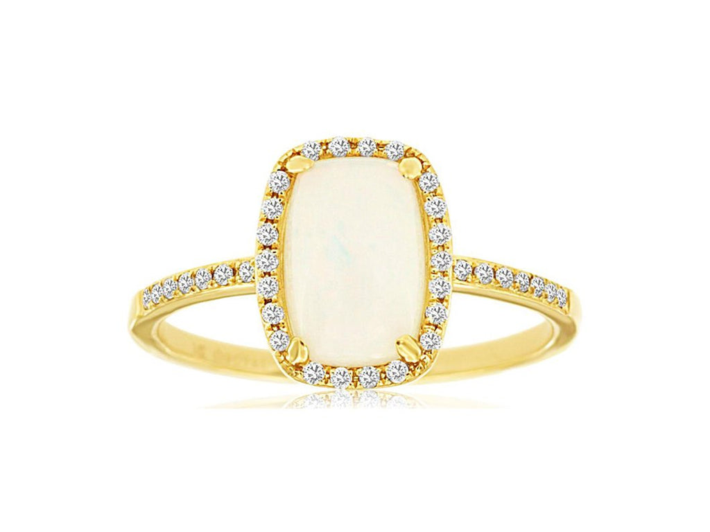 14KT YELLOW GOLD FUN RING. 3D HALO RECTANGULAR DESIGN. ROUND DIAMONDS ARE F/G COLOR, VSSI CLARITY .14 CARATS. AAA CUSHION CUT OPAL IS 1.0 CARAT. RING SIZE 7. CAN BE SIZED BY OUR MASTER JEWELER UPON REQUEST. WRITTEN APPRAISAL AVAILABLE. COMES IN A PRESENTABLE GIFT BOX.