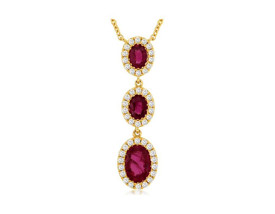 1.14CT DIAMOND & AAA RUBY 14KT YELLOW GOLD OVAL & ROUND 3 STONE JOURNEY NECKLACE