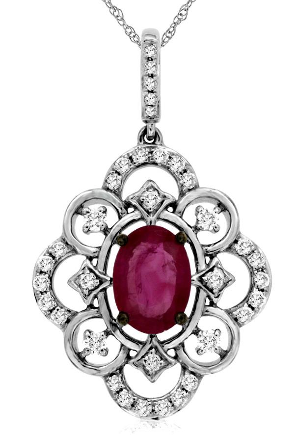 14KT WHITE GOLD FLOATING PENDANT. 3D OPEN FILIGREEDESIGN. ROUND DIAMONDS ARE F/G COLOR, VSSI CLARITY 0.24 CARATS. AAA OVAL RUBYIS 0.90CARATS.COMES ON A 14KT GOLD DIAMOND CUT 16" INCH CHAIN.WRITTEN APPRAISAL AVAILABLE. COMES IN A PRESENTABLE GIFT BOX.