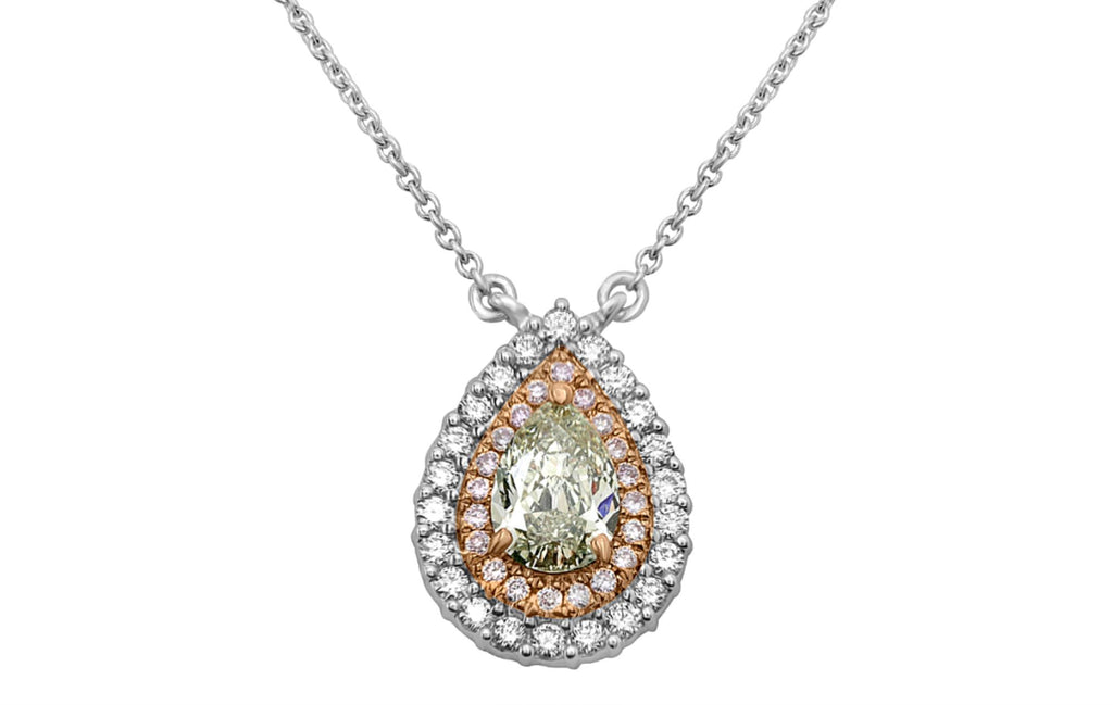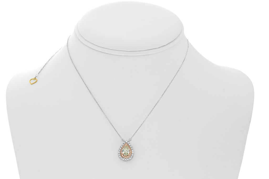 1.14CT WHITE GREEN & PINK DIAMOND 18KT WHITE & ROSE GOLD HALO TEAR DROP NECKLACE