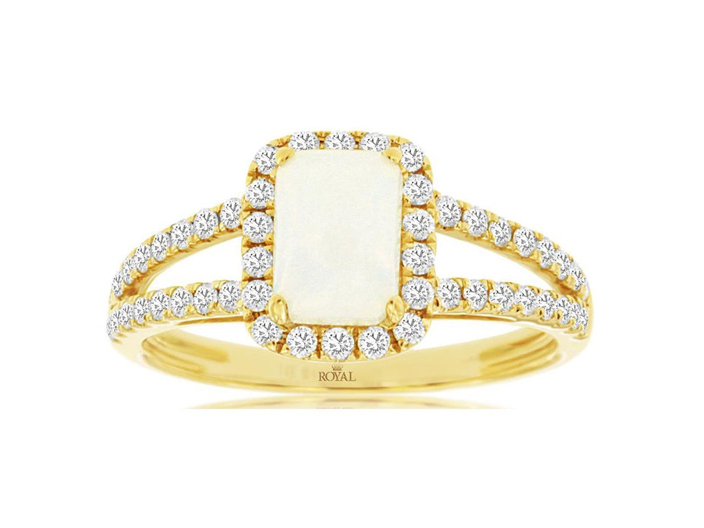 14KT YELLOW GOLD FRIENDSHIP PROMISE RING. 3D HALO SQUARE DESIGN. ROUND DIAMONDS ARE F/G COLOR, VSSI CLARITY .45 CARATS. AAA CUSHION CUT OPAL IS .70 CARATS. RING SIZE 7. CAN BE SIZED BY OUR MASTER JEWELER UPON REQUEST. WRITTEN APPRAISAL AVAILABLE. COMES IN A PRESENTABLE GIFT BOX.