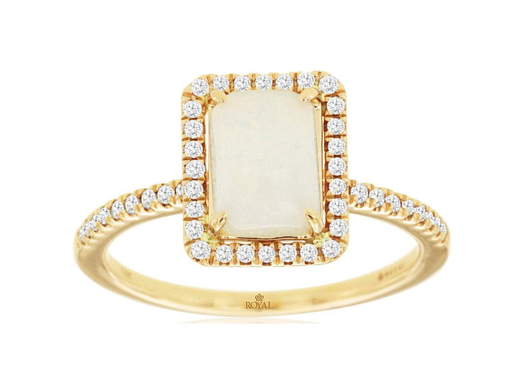 14KT YELLOW GOLD FRIENDSHIP RING. 3D CLASSIC HALO OCTAGON DESIGN. ROUND DIAMONDS ARE F/G COLOR, VSSI CLARITY .20 CARATS. AAA CUSHION CUT OPAL IS .95 CARATS. RING SIZE 7. CAN BE SIZED BY OUR MASTER JEWELER UPON REQUEST. WRITTEN APPRAISAL AVAILABLE. COMES IN A PRESENTABLE GIFT BOX.