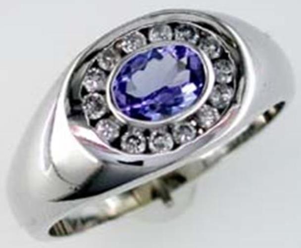 14KT WHITE GOLD MEN'S RING. 3D CLASSIC DESIGN. ROUND DIAMONDS ARE F/G COLOR, VSSI CLARITY .30 CARATS. AAA OVAL TANZANITE IS .85 CARATS. RING SIZE 10. CAN BE SIZED BY OUR MASTER JEWELER UPON REQUEST. WRITTEN APPRAISAL AVAILABLE. COMES IN A PRESENTABLE GIFT BOX.