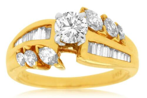 14KT YELLOW GOLD ENGAGEMENT RING. 3D CLASSIC DESIGN. ROUND, BAGUETTE, AND MARQUISE SHAPE DIAMONDS ARE F/G COLOR, VSSI CLARITY 1.16 CARATS. CAN BE SIZED BY OUR MASTER JEWELER UPON REQUEST. WRITTEN APPRAISAL AVAILABLE. COMES IN A PRESENTABLE GIFT BOX.