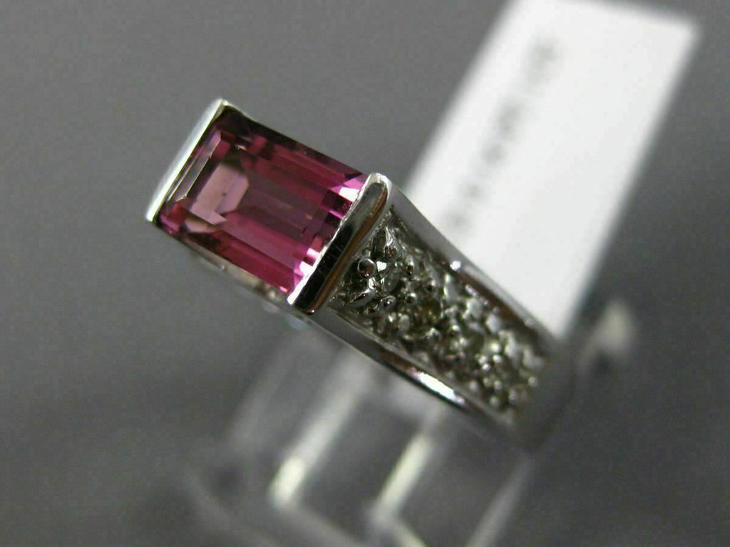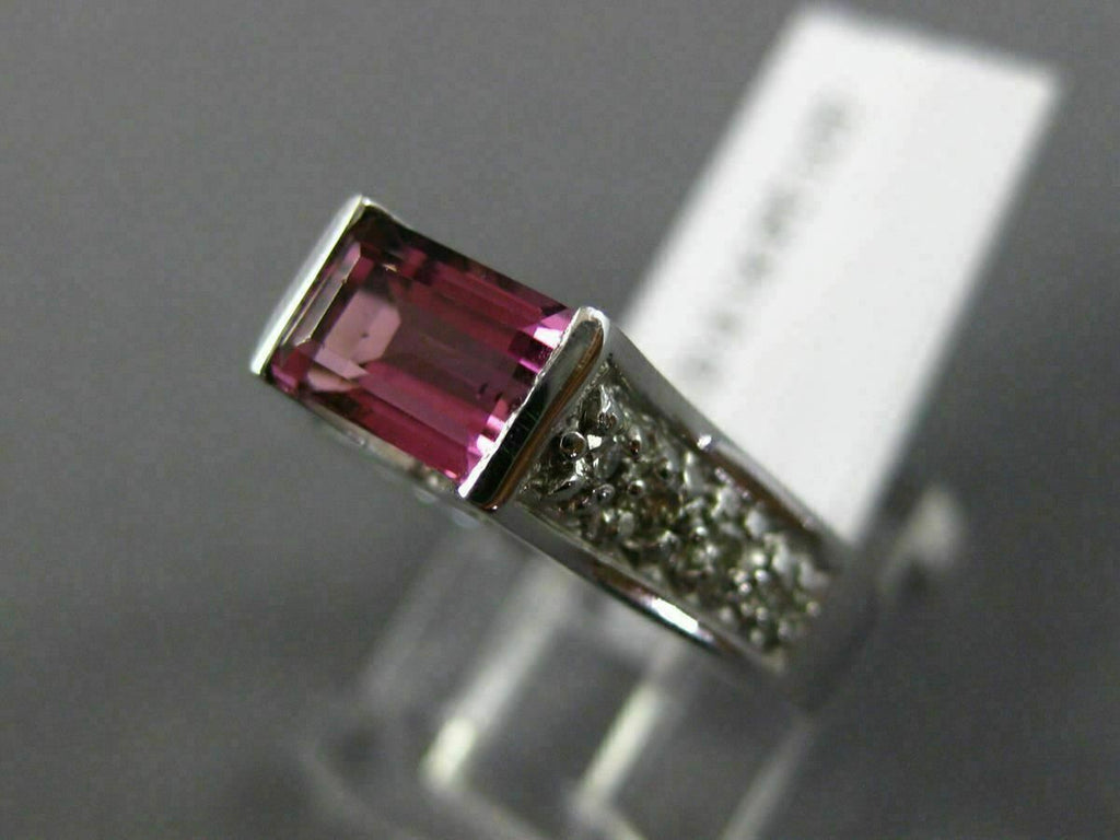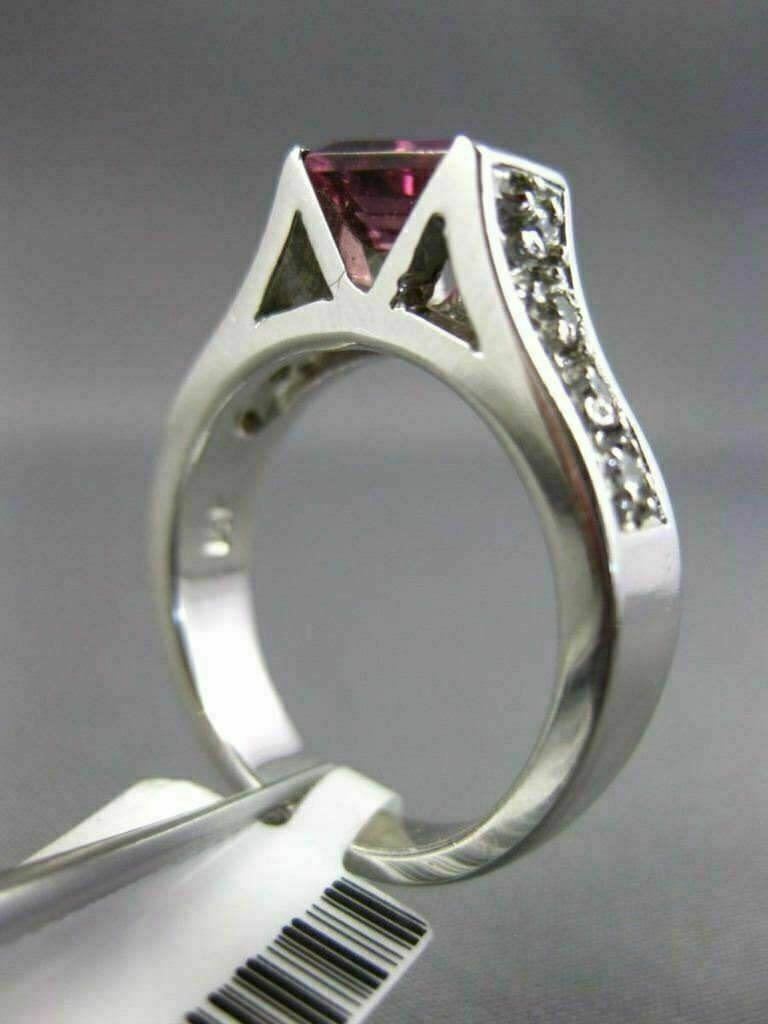 14KT WHITE GOLD ENGAGEMENT RING. 3D DESIGN. DIAMONDS ARE F/G COLOR, VSSI CLARITY .16 CARATS. AAA PINK TOURMALINE IS 1.0 CARAT. MEASURES 5mm WIDE. RING SIZE 6.25. CAN BE SIZED BY OUR MASTER JEWELER UPON REQUEST. WRITTEN APPRAISAL AVAILABLE. COMES IN A PRESENTABLE GIFT BOX