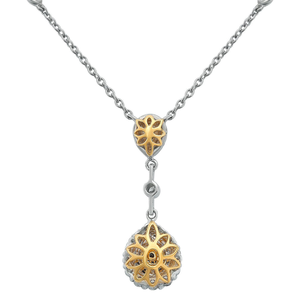 18KT WHITE &YELLOW GOLD LARIAT NECKLACE. 3D TEAR DROP HEART DESIGN. DIAMOND IS F/G COLOR, VSSI CLARITY .63 CARATS. FANCY YELLOWDIAMONDS ARE .53 CARATS. MEASURES 30mm X 11mm. 17" INCHES CHAIN. WRITTEN APPRAISAL AVAILABLE.COMES IN A PRESENTABLE GIFT BOX.