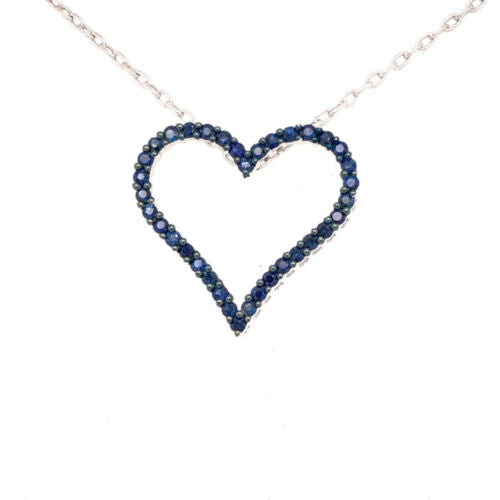 18KT WHITE GOLD LOVE FLOATING PENDANT. 3D CLASSIC OPEN HEART DESIGN. AAA SAPPHIRES ARE 1.17 CARATS. COMES ON A 14KT GOLD DIAMOND CUT 16" INCH CHAIN.