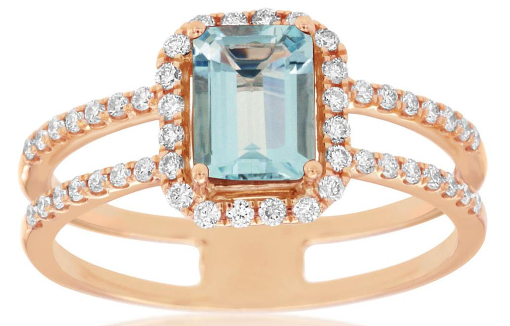 1.17CT DIAMOND & AAA AQUAMARINE 14KT ROSE GOLD HALO DOUBLE BAND ENGAGEMENT RING