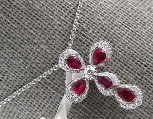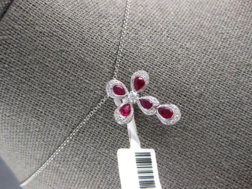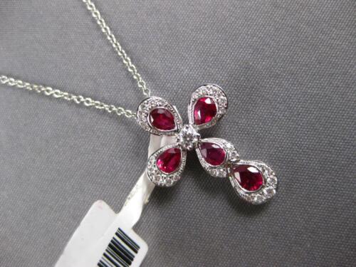 18KT WHITE GOLD FLOATING PENDANT. 3D CROSS DESIGN. ROUND DIAMONDS ARE F/G COLOR, VSSI CLARITY .19 CARATS. AAA PEAR SHAPE RUBIES ARE .98 CARATS. MEASURES 20mm X 14.5mm. COMES ON A 14KT GOLD DIAMOND CUT 16" INCH CHAIN. WRITTEN APPRAISAL AVAILABLE. COMES IN A PRESENTABLE GIFT BOX.