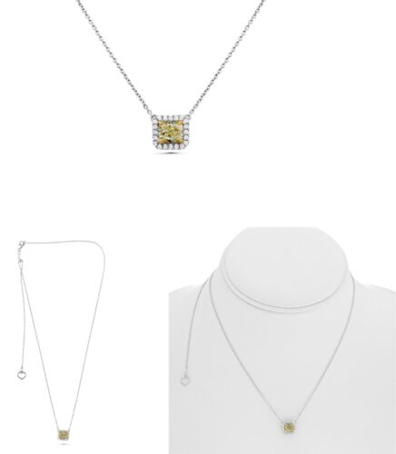 18KT WHITE AND YELLOW GOLD LOVE NECKLACE. 3D SOLITAIRE HALO DESIGN. ROUND WHITE DIAMONDS ARE F/G COLOR, VS CLARITY .15 CARATS. CUSHION CUT FANCY YELLOW DIAMOND IS 1.02 CARATS. 17" INCHES LONG.